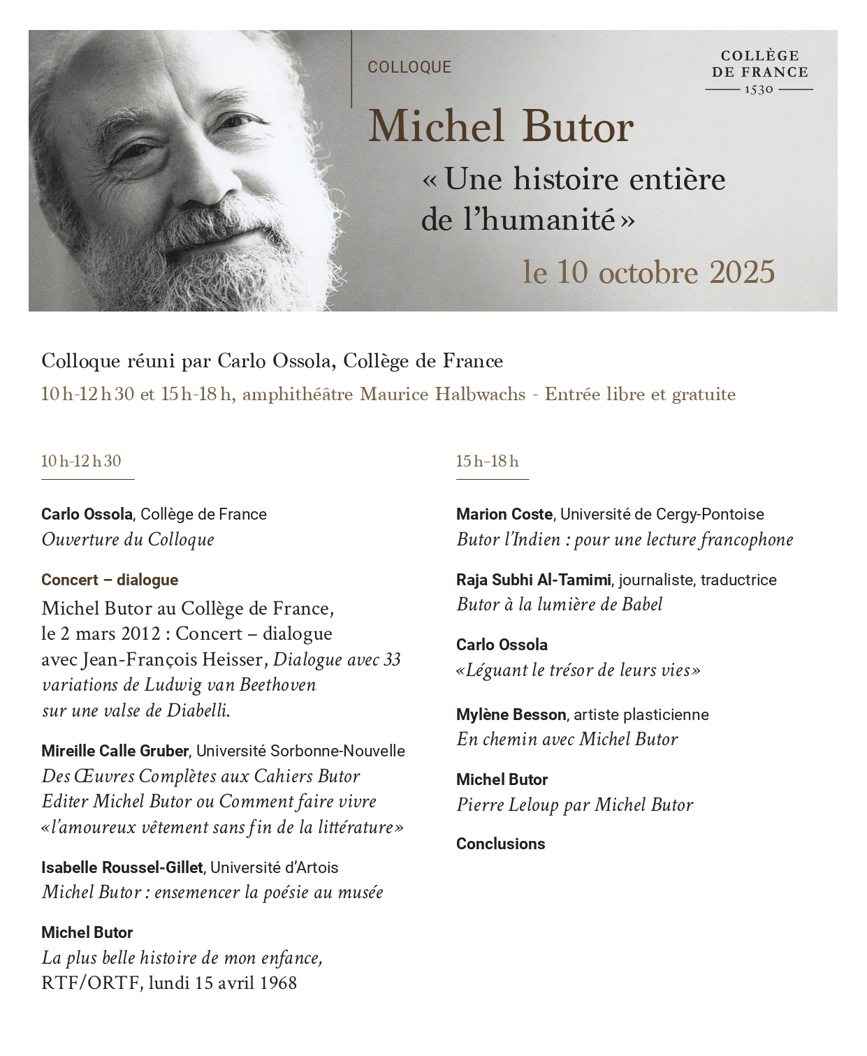 • 10 octobre 2025 : Colloque Une histoire entière de l’humanité, par Carlo Ossola, au Collège de France (Amphithéâtre Maurice Halbwachs, Paris).