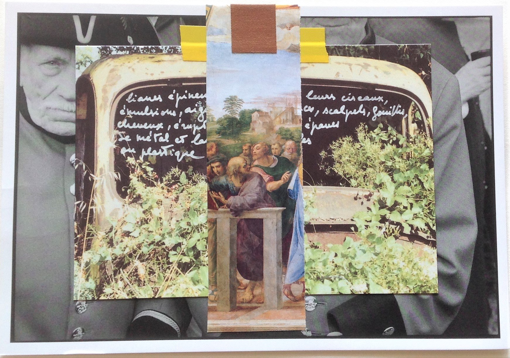 C’est suite à un voyage aux Etats-Unis dans les années 70 qu’il commença à réaliser des cartes postales personnalisées. Images rapportées suite à des visites de musées, ciseaux, encre de chine et scotchs colorés sont les matériaux essentiels à leur conception.